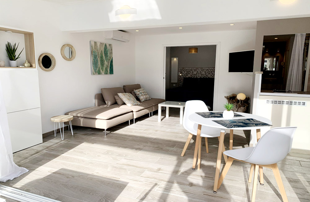 Dans la pièce principale ouvrant entièrement sur l’extérieur se trouvent un coin salon confortable avec TV écran plat (chaines françaises et internationales) et une grande cuisine ouverte avec table et chaises bar.